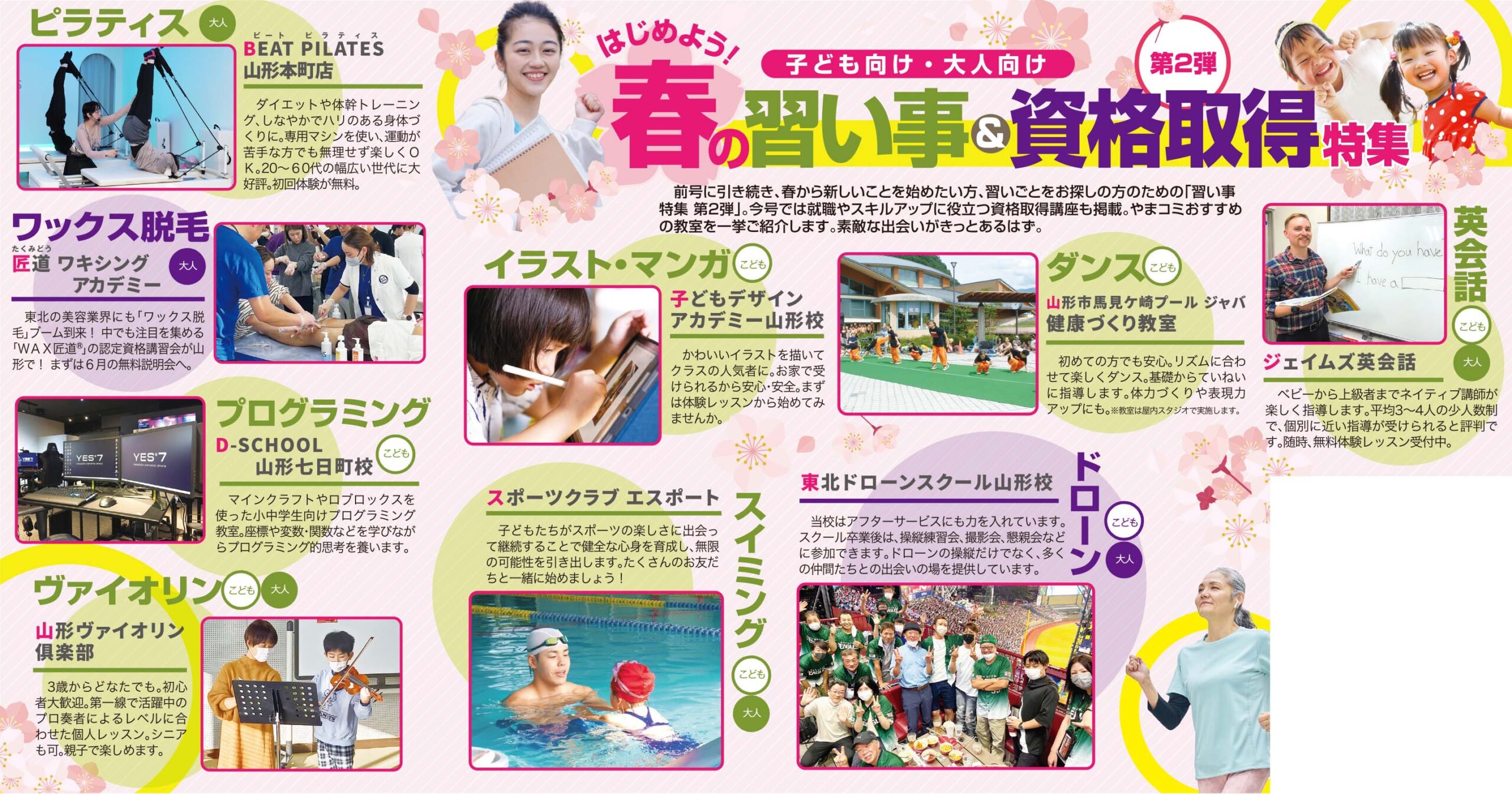 前号に引き続き、春から新しいことを始めたい方、習いごとをお探しの方のための「習い事特集第2弾」。今号では就職やスキルアップに役立つ資格取得講座も掲載。やまコミおすすめの教室を一挙ご紹介します。素敵な出会いがきっとあるはず。